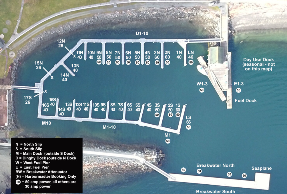 - Protected Bay Anchorage with 35 well-equipped slips for overnight moorage.